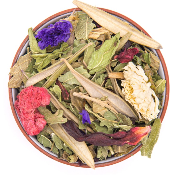 Клубника лист, мята, олива лист, каркаде, малина ягоды, хризантема цветы, незабудка цветы